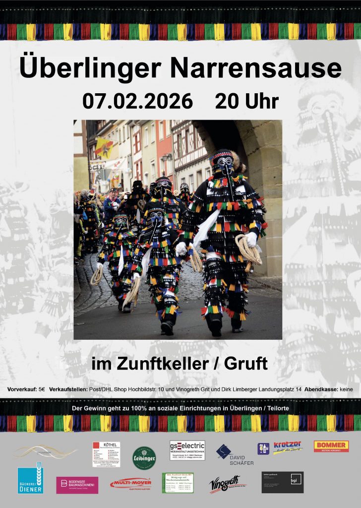 Die Überlinger Narrensause feiert Jubiläum: Bereits zum zehnten Mal veranstaltet die Hänselezunft ihre beliebte Fastnachtsparty. Gefeiert wird am Samstag, 7. Februar, ab 20 Uhr im Gewölbekeller der Narrenzunft – der sogenannten „Gruft“ in der Turmgasse 7. Der Zugang zur Veranstaltung erfolgt über die Grabenstraße.